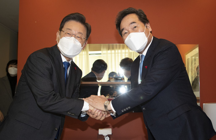 | ▲ 더불어민주당 이재명 대선 후보(왼쪽)와 이낙연 전 대표가 23일 서울 중구 달개비 식당에서 열린 오찬회동에서 손을 잡고 인사하고 있다. 2021.12.23 [국회사진기자단] |