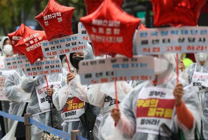 [열린의정뉴스 = 김윤영 기자] 6일 서울 파이낸스빌딩 앞에서 민주노총 콜센터노조 조합원들이 정규직 전환과 노동가치 인정 등을 요구하며 기자회견을 하고 있다. 2021.10.6
