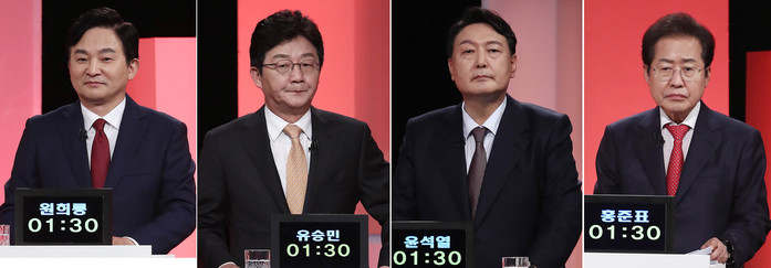 ▲ 국민의힘 선거관리위원회는 8일 국회에서 이같은 내용의 2차 예비경선(컷오프) 결과를 발표했다. 사진은 지난 5일 서울 여의도 한국방송공사 스튜디오에서 열린 제6차 방송토론회에서 원희룡·유승민·윤석열·홍준표 후보(왼쪽부터 가나다순)가 토론을 준비하는 모습. 2021.10.8 [연합뉴스 자료사진]