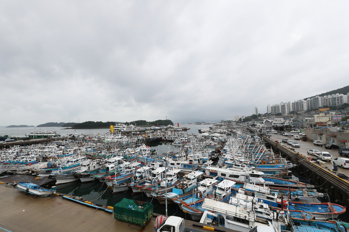 [열린의정뉴스 = 김윤영 기자] 제12호 태풍 '오마이스'가 북상하는 23일 오후 전남 여수시 국동항에 피항한 어선들 위로 먹구름이 드리웠다. 2021.8.23