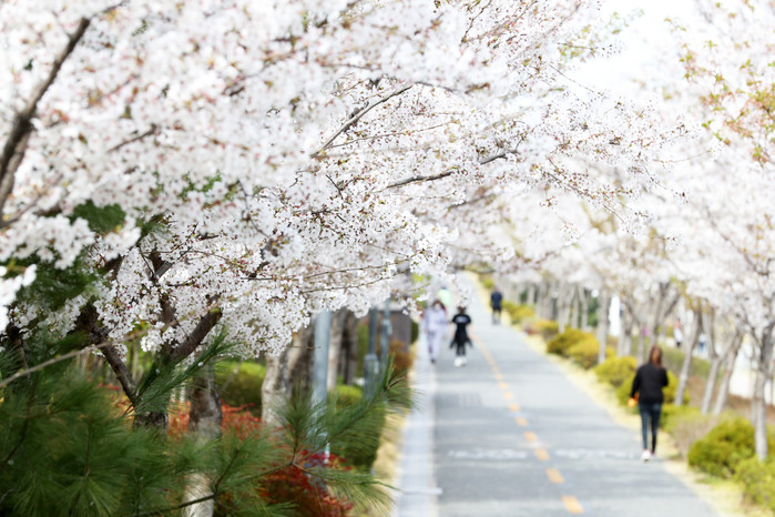 [열린의정뉴스 = 김윤영 기자] 5일 경북 포항시 남구 대이동 일대 철길숲에 벚꽃이 활짝 핀 가운데 시민이 산책하고 있다. 2022.4.5
