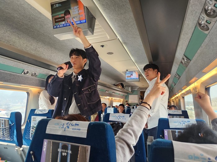 | ▲지난 1일 KTX 421열차 승객들이 철도 굿즈 증정 이벤트에 참가하는 모습[출처=한국철도공사] |