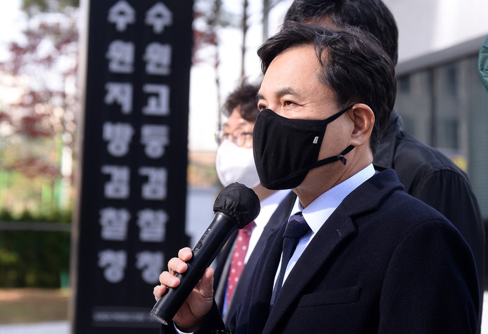 ▲ 김진태 국민의힘 이재명 비리 국민검증특위 위원장이 17일 경기도 수원시 수원지방검찰청 후문 앞에서 더불어민주당 이재명 대선후보 '변호사비 대납 의혹' 수사와 관련해 발언하고 있다. 2021.11.17 [국회사진기자단]