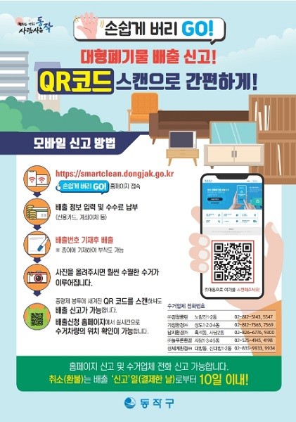한편, 구는 언택트 시대에 발맞춰 지난달부터 비대면 스마트 배출·수거 통합관리시스템 ‘손(I)쉽게 버리고(go)’ 웹을 구축 해 배출자가 QR코드를 활용, 배출부터 결제까지 전 과정을 간편하게 신청하고 대행업체는 알림 확인 후 폐기물을 즉시 수거 할 수 있도록 하고 있다.