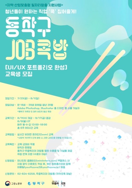 ‘동작구 JOB콕밥’ 사업은 만 18세 이상 39세 이하 미취업 청년에게 취업 역량 향상을 위한 ▶UI/UX 디자이너 양성 교육 프로그램 ▶일대일(1:1) 직무 상담 ▶청년 일자리 정보 제공 등을 지원하여 관내 서비스업 기반 디자인·기획 분야 전문 인력을 양성하고자 마련됐다.