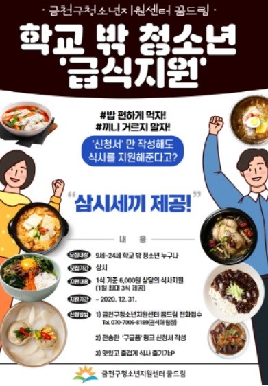 금천청소년지원센터 꿈드림을 이용하는 모든 학교 밖 청소년(9∼24세)을 대상으로, 소득수준과 관계없이 1식 기준 6천원 상당, 1일 최대 3식까지 지원한다.