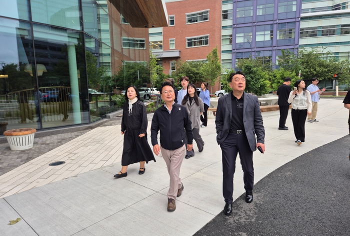 ▲ 육동한 춘천시장이 현지시간 14일 미국 보스턴 켄달스퀘어 내 모더나, 아스트로제네카 등 바이오 기업 밀집 지역을 둘러보며 클러스터 구조를 살펴보고 있다.