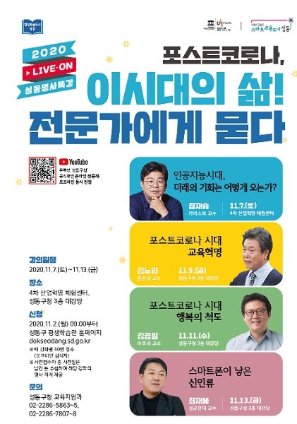 정원오 성동구청장은 “한동안 목말라 있던 인문학 강연을 온·오프라인을 통해 맞춤형으로 들을 수 있는 기회를 마련했다”며 “힘든 시기 삶의 지혜와 마음의 양식을 쌓는 시간이 되길 기대한다”고 말했다.