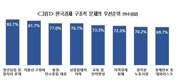 이어 '저출산&고령화'(81.7%), '환경 및 탄소중립 대응'(77.0%), '성장잠재력 저하'(76.7%) 등 순이었다.