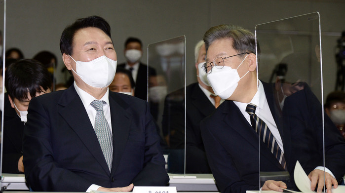 이 후보는 "존경하는 윤 후보님이 와 계신 데 종전선언을 넘어 평화협정으로 가야 한다"며 "국민적 합의가 없기에 시기상조라고 말씀하신 것으로 기억하는데, 국민 67%가 종전선언에 찬성한다. 객관적 사실을 확인하시고 전향적 재검토를 요청드린다"고 요청했다.