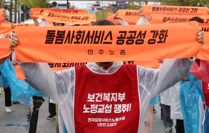 [열린의정뉴스 = 김윤영 기자] 민주노총 서비스연맹 전국요양서비스노동조합 등이 29일 오후 세종시 어진동 고용노동부 앞에서 돌봄노동자 처우개선 등을 요구하며 결의대회를 하고 있다. 2021.9.29
