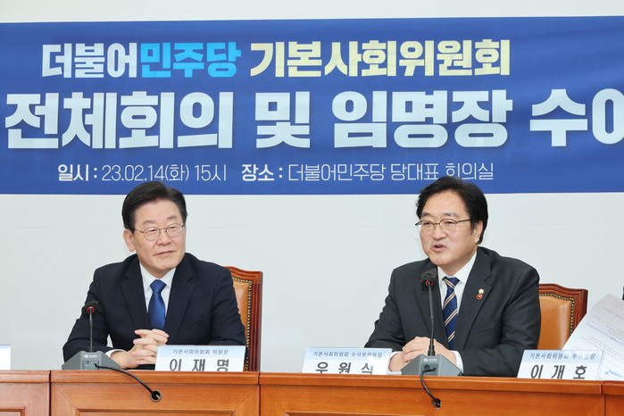| ▲ 기본사회위원회 수석부위원장인 더불어민주당 우원식 의원이 14일 오후 국회에서 열린 기본사회위 제1차 전체회의 및 임명장 수여식에서 발언하고 있다. 왼쪽은 위원장인 이재명 대표. 2023.2.14 |