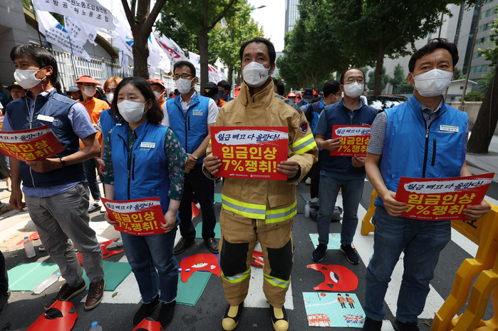 [열린의정뉴스 = 김윤영 기자] 15일 오후 정부서울청사 앞에서 공무원노조 주최로 공무원 임금인상 쟁취 결의대회가 열리고 있다. 2022.7.15