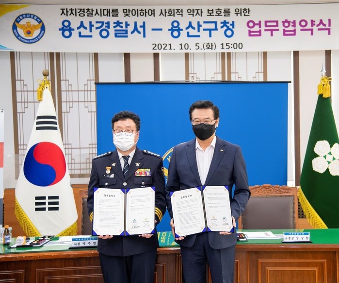 | ▲ 성장현 용산구청장(오른쪽)과 박주현 용산경찰서장(왼쪽)이 5일 사회적 약자 보호를 위한 업무 협약을 맺고 기념사진을 찍었다 [용산구청 제공] |