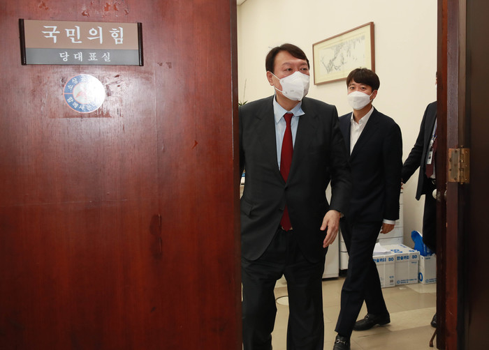 ▲ 국민의힘 이준석 대표와 윤석열 대선 경선 예비후보가 6일 오전 서울 여의도 국회 당대표실에서 회동한 후 함께 걸어나오고 있다. 2021.9.6 [국회사진기자딘]