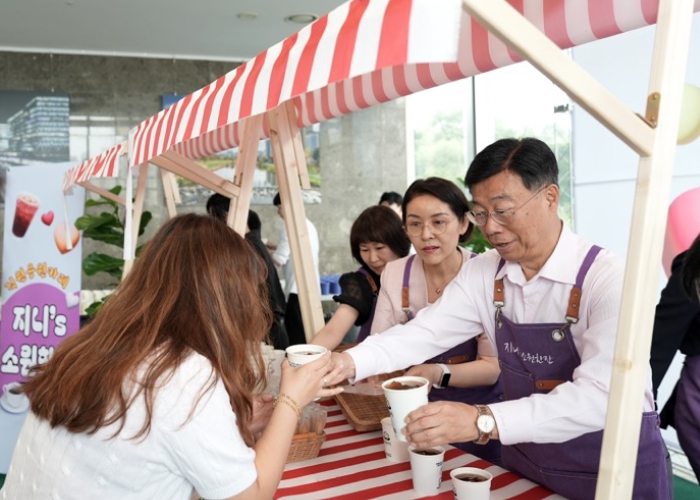 이날 낮 12시 시청 1층 누리홀에 마련된 카페 ‘지니's 소원한잔’에서 신 시장은 직접 커피를 건네며 시정 발전을 위해 노력하는 직원들에게 감사와 격려의 마음을 전했다.