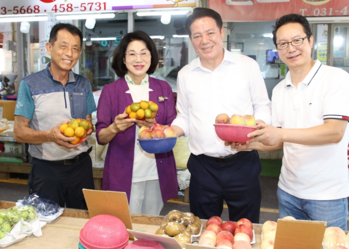 | ▲ 최대호 안양시장은 28일 동안구 호계시장에서 소비쿠폰을 사용해 과일 등의 먹거리를 구매했다. |