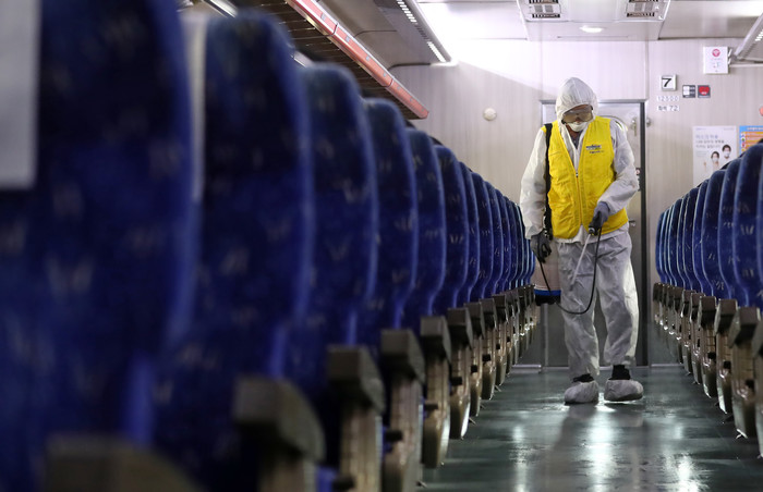 [열린의정뉴스 = 김윤영 기자] 13일 오후 대전시 대덕구 읍내동 조차장역에서 한국철도공사 관계자가 추석 명절을 앞두고 무궁화 열차를 소독하고 있다. 2021.9.13