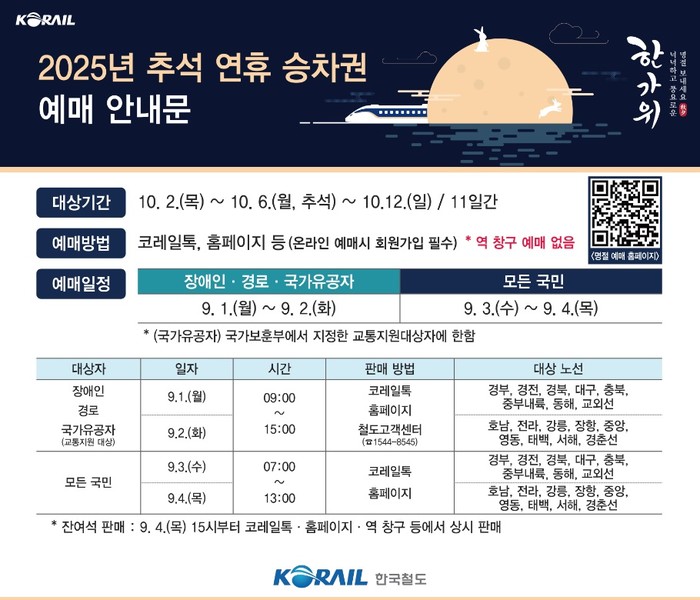 한국철도공사(코레일)는 오는 9월 1일부터 4일까지 나흘간 ‘2025년 추석 연휴 승차권 예매’를 실시한다고 25일 밝혔다.