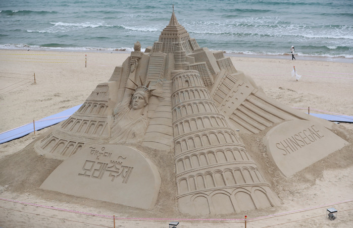 [열린의정뉴스 = 김윤영 기자] 19일 오후 부산 해운대해수욕장에 모래축제를 알리는 작품이 설치돼 있다. 해운대 모래축제는 '모래로 만나는 세계여행'을 주제로 20일부터 23일까지 열린다. 2022.5.19
