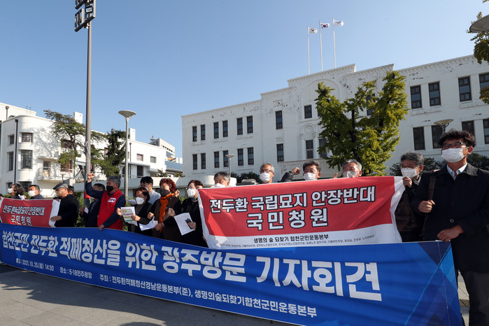 [열린의정뉴스 = 김윤영 기자] 25일 오후 광주 동구 옛 전남도청 앞에서 경남 합천지역 시민단체가 5·18단체와 함께 전두환 전 대통령 찬양 중단과 사후 국립묘지 안장에 반대하는 기자회견을 열고 있다. 이날 기자회견을 연 시민단체는 합천에서 전씨 아호를 딴 일해공원의 명칭 변경 운동을 하고 있다. 2021.10.25