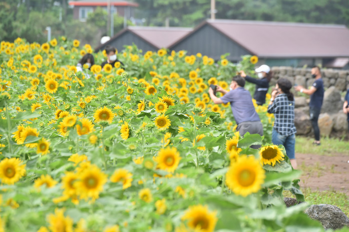 [열린의정뉴스 = 김윤영 기자] 제12호 태풍 오마이스가 물러간 24일 제주시 애월읍 구엄리 해안도로를 찾은 관광객들이 활짝 핀 해바라기를 감상하고 있다. 2021.8.24