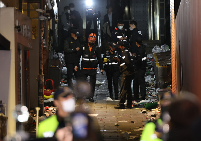 | ▲ 소방당국 관계자들이 30일 오전 서울 용산구 이태원 핼러윈 인명사고 현장을 조사하고 있다. 2022.10.30 |