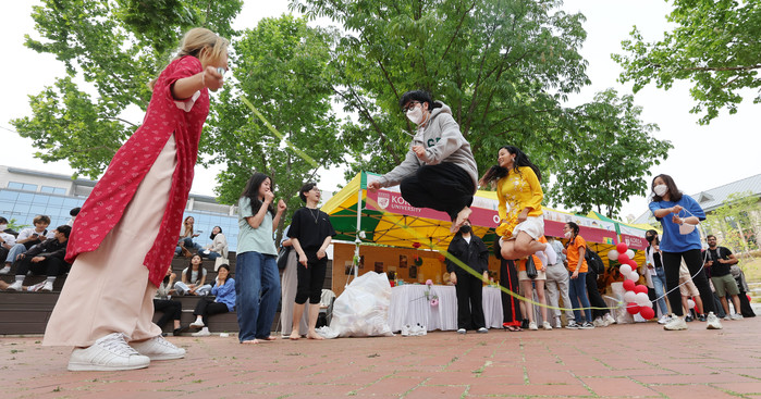 [열린의정뉴스 = 김윤영 기자] 19일 오후 서울 성북구 고려대학교 민주광장에서 열린 2022 외국인학생 축제에서 학생들이 줄넘기를 하고 있다. 2022.5.19
