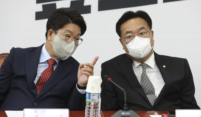 | ▲ 국민의힘 정진석 비상대책위원장과 권성동 원내대표가 14일 오전 서울 여의도 국회에서 열린 비상대책위원회 회의에서 대화하고 있다. 2022.9.14 [국회사진기자단] |