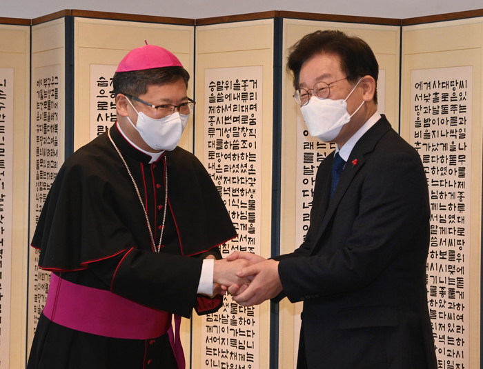 | ▲ 더불어민주당 이재명 대표가 20일 오후 서울 중구 명동 천주교 서울대교구장 정순택 대주교를 예방해 인사를 나누고 있다. 2022.12.20 [국회사진기자단] |