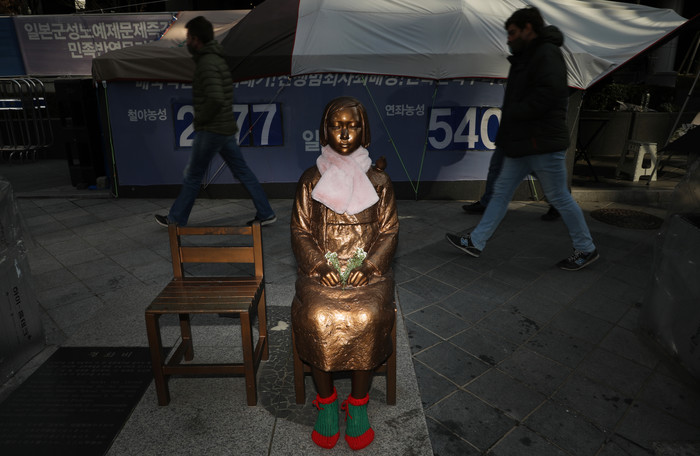 [열린의정뉴스 = 김윤영 기자] 14일 옛 일본대사관 앞 평화의 소녀상 모습. 평화의 소녀상은 위안부 문제 해결을 위한 제1000차 정기 수요시위에 맞춰 2011년 12월 14일 당시 주한 일본대사관 앞에 처음 세워졌다. 정의기억연대에 따르면 올해 10월 기준으로 소녀상은 국내 144기·국외 16기(철거 제외)로 불어났다. 2021.12.14