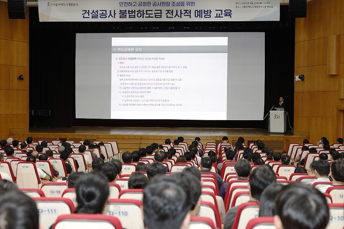 이번 교육은 공사 현장에서 발생할 수 있는 불법하도급을 사전에 차단하고, 건전하고 투명한 건설문화를 확립하기 위해 마련됐다. 교육에는 SH 내부 직원뿐 아니라 SH 건설현장의 현장대리인, 건설사업관리기술인 등 실무자가 함께 참여했다.