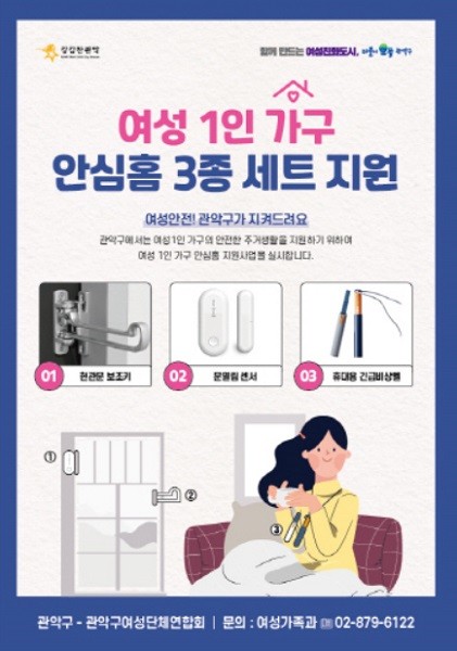 [열린의정뉴스 = 최성일 기자] 서울 관악구(구청장 박준희)가 여성 1인 가구의 안전한 주거생활을 지원하기 위해 '여성 1인 가구 안심홈 3종 세트 지원사업'을 확대·실시한다.
