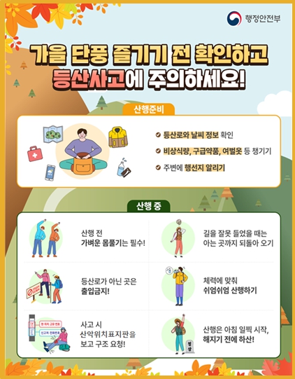 [코리아 이슈저널=최용달 기자] 행정안전부는 가을 단풍철을 맞아 산행 시 실족이나 조난 등 안전사고 예방에 각별히 주의할 것을 당부했다.