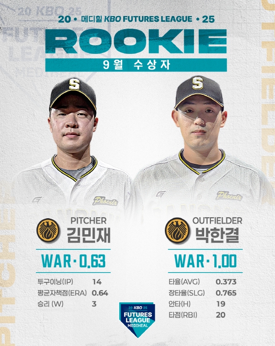 [코리아 이슈저널=최용달 기자] 2025 메디힐 KBO 퓨처스리그의 9월 퓨처스 루키상 수상자로 투수 부문에는 상무 김민재가 WAR 0.63, 타자 부문에는 상무 박한결이 WAR 1.00을 기록하며 각각 선정됐다.