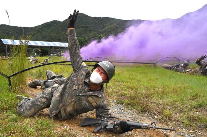 [열린의정뉴스 = 김윤영 기자] 마스크를 착용한 제273기 해군 부사관 후보생이 13일 경남 창원시 진해구 해군교육사령부 야전 교육 훈련대대에서 개인 침투 훈련을 하고 있다. 2021.10.13