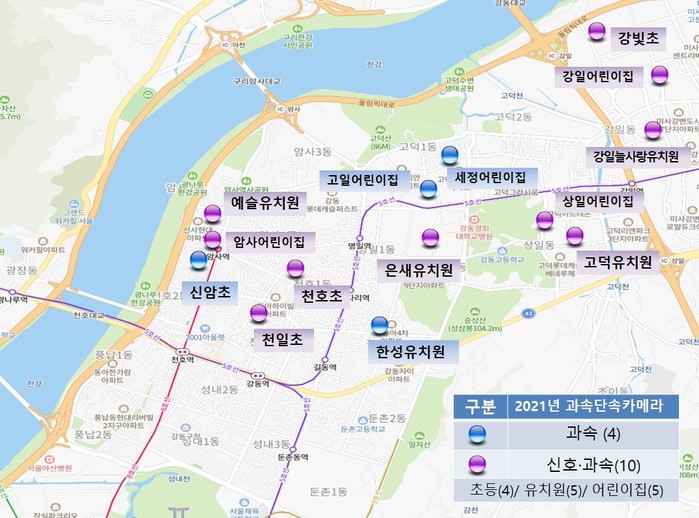 구는 지난해 어린이보호구역 27개소 과속단속카메라 설치에 이어, 올해 강빛초등학교를 포함한 14개소에 확대 설치할 예정이다. 설치 예정 대상지는 ▲초등학교 4개소 ▲유치원 5개소 ▲어린이집 5개소이며, 7개소씩 2회에 걸쳐 공사가 진행되며 올해 연말까지 모든 공사가 마무리될 계획이다. 올해 설치되는 신규 14개소에 대한 자세한 위치는 강동구청 홈페이지 고시공고란을 통해 확인할 수 있다.