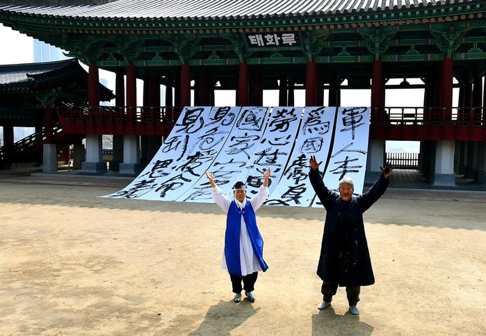 [열린의정뉴스 = 김윤영 기자] 안중근 의사 순국일을 앞둔 24일 울산 태화루에서 독도 사랑 예술인 연합회 김지영 회장(왼쪽)과 독도 수호 결사대 대장 김동욱 서예가가 순국 112주년 기념 어록 퍼포먼스를 펼친 뒤 기념 촬영하고 있다. 2022.3.24