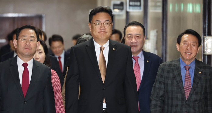| ▲ 국민의힘 정진석 비상대책위원장과 주호영 원내대표 등 지도부가 16일 국회에서 열린 비상대책위원회에 참석하고 있다. 2023.2.16 |