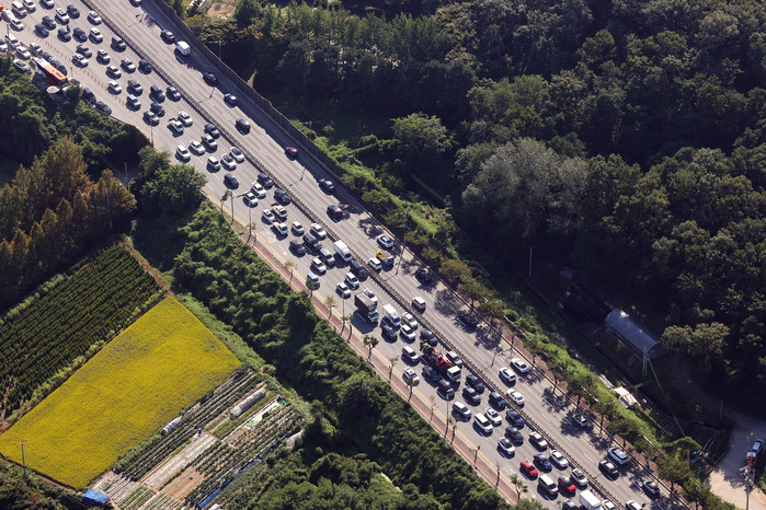 [열린의정뉴스 = 김윤영 기자] 추석 연휴를 하루 앞둔 8일 오후 경찰청 헬기에서 바라본 경기도 용인시 신갈JC 인근 경부고속도로에서 귀성 차량 등이 이동하고 있다. 2022.9.8 [항공촬영협조 = 이석주 경감, 장도형 경위]