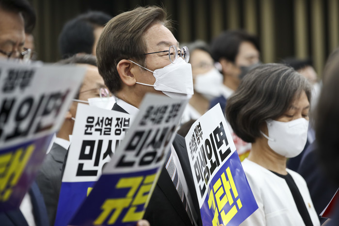 | ▲ 더불어민주당 이재명 의원이 11일 오후 국회에서 열린 의원총회에서 동료 의원들과 함께 윤석열 정부를 규탄하는 피켓을 들고 있다. [연합뉴스 자료사진] |