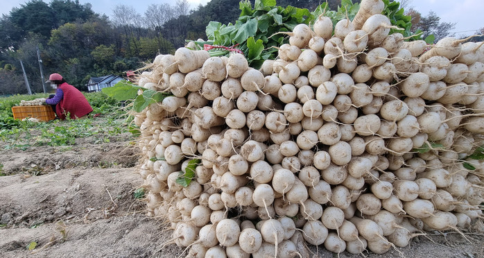 [열린의정뉴스 = 김윤영 기자] 18일 오후 강원 강릉시 구정면 농촌 들녘에서 농민들이 무를 수확하고 있다. 2021.11.18