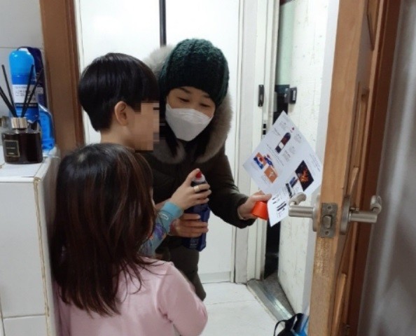 또 보호자 없이 아이들끼리 집에 남겨지는 경우를 대비해 아이들도 사용하기 쉬운 스프레이형 가정용 소화기를 가구별로 1개씩 전달한다.