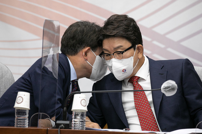 | ▲ 국민의힘 권성동 원내대표(오른쪽)와 성일종 정책위의장이 10일 오전 서울 여의도 국회에서 열린 원내대책회의에서 대화하고 있다. 2022.6.10 [국회사진기자단] |