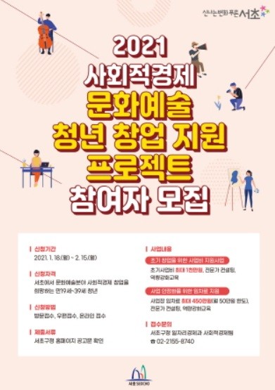 [열린의정뉴스 = 최성일 기자] 서울 서초구는 문화예술 분야 사회적경제기업 창업을 희망하는 관내 청년(만 19∼39세)을 대상으로 '2021 사회적경제 문화예술 청년 창업지원 프로젝트' 공모를 오는 2월 15일까지 모집한다고 밝혔다.