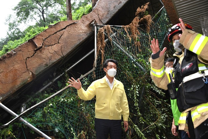 | ▲ 오세훈 서울시장이 9일 오전 전일 내린 집중호우로 침수피해를 본 서울 동작구 사당동 극동아파트 축대 붕괴 현장을 찾아 피해 상황을 살펴보고 있다. 2022.8.9 [서울시 제공. 재판매 및 DB 금지] |