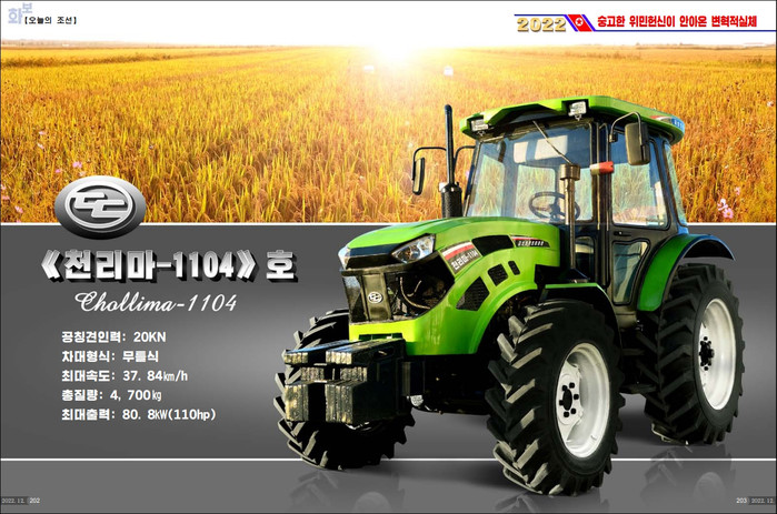 [열린의정뉴스 = 김윤영 기자] 북한 외국문출판사가 운영하는 '조선의 출판물' 홈페이지에 8일 공개된 '2022 숭고한 위민헌신이 안아온 변혁적 실체' 화보는 남포시 금성뜨락또르(트랙터)공장이 지난 11월 1단계 개건현대화 공사를 마쳤다고 전했다. 사진은 공장에서 생산한 트랙터 '천리마-1104'호. [북한 대외용 화보 '조선' 12월호 캡처. 재판매 및 DB 금지]
