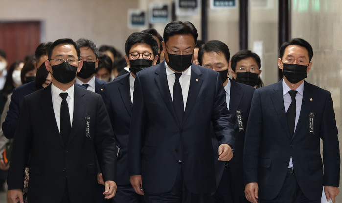 | ▲ 국민의힘 정진석 비상대책위원장과 주호영 원내대표가 2일 오전 서울 여의도 국회에서 열린 비상대책위원회의에 참석하고 있다. 2022.11.2 |