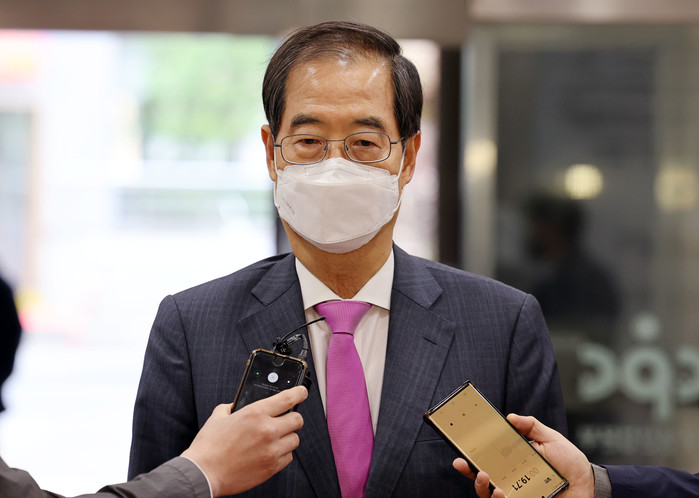 ▲ 한덕수 국무총리 후보자가 19일 오전 서울 종로구 한국생산성본부 건물에 마련된 국회 인사청문회 준비단 사무실로 출근하며 취재진 질문에 답하고 있다. 2022.4.19