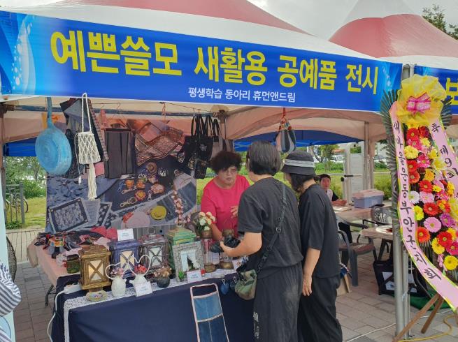 이번 전시에는 평생학습 동아리 ‘휴먼앤드림’회원들이 직접 제작한 업사이클링(Up-cycling) 공예 작품 10여점이 소개됐으며, 버려진 물건을 재활용하는 차원을 넘어 새로운 가치를 불어넣은 작품들을 통해 환경보호와 자원 순환의 의미를 전하고 지역민과 함께 친환경적 변화를 모색하는 뜻깊은 자리가 됐다.